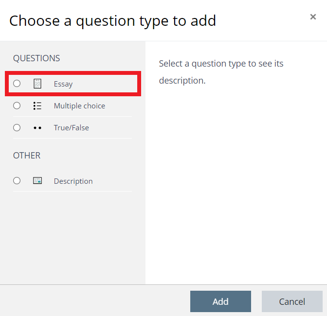NOTE: The essay question will need to be manually graded (even if worth 0 points). - Once all needed questions have been added to the assignment, click Save Assignment.