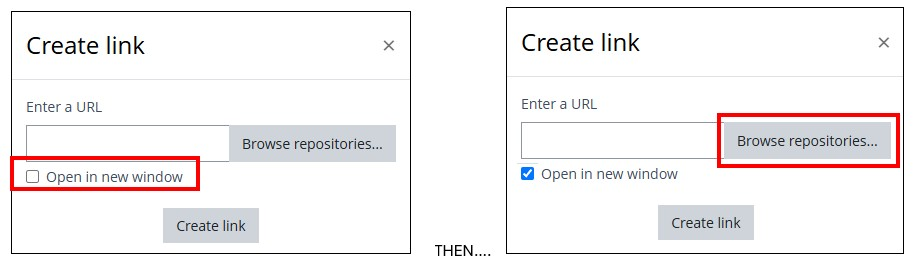 - In the Create link modal, FIRST click box to Open in new window THEN click Browse repositories….(do not paste in the link).