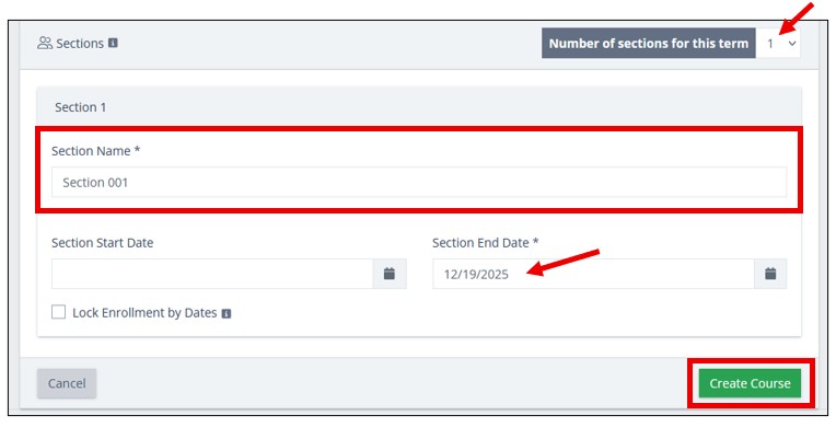 Name the Section(s) and enter the Section End Date for each.- Section Start Date is optional (beginning of term)