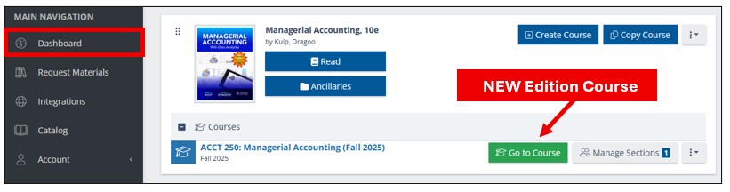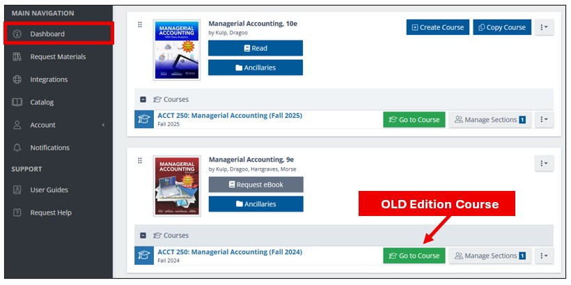- Go back to the original window/tab showing your Dashboard. Open the OLD edition course by clicking the green Go to Course Button.