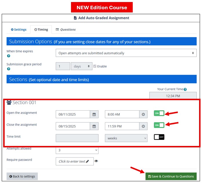 - Set Timing for each Section as needed in NEW Course by toggling the Open and Close Date/Time fields to ON and setting as needed for the assignment.